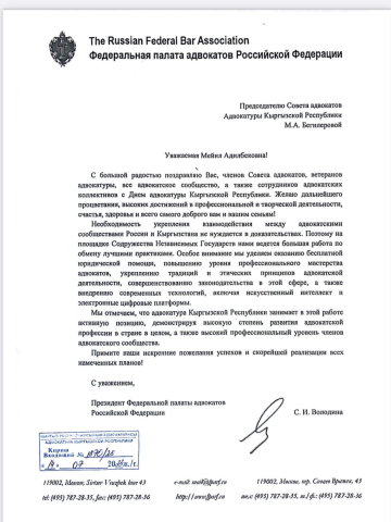 Совет адвокатов Адвокатуры Кыргызской Республики выражает глубокую благодарность Палате адвокатов Российской Федерации за внимание и тёплые поздравления.