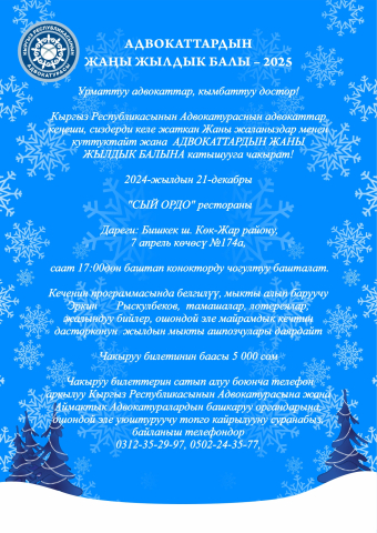 Кыргыз Республикасынын Адвокатураснын адвокаттар кенеши, сиздерди келе жаткан Жаңы жалаңыздар менен куттуктайт жана АДВОКАТТАРДЫН ЖАҢЫ ЖЫЛДЫК БАЛЫНА катышууга чакырат!