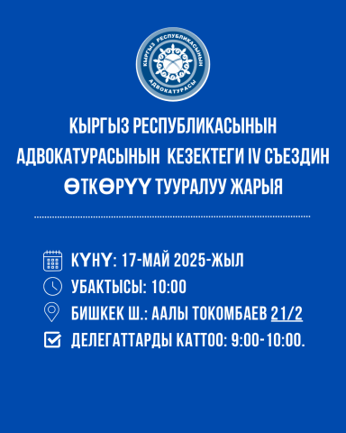 17-май 2025-жылы саат 10:00дө, Бишкек ш., Аалы Токомбаев көч., 21/2 дареги боюнча КыргызРеспубликасынын Адвокатурасынынадвокаттарынын кезектеги съезди өтөт.Делегаттарды каттоо 9: 00-10: 00.