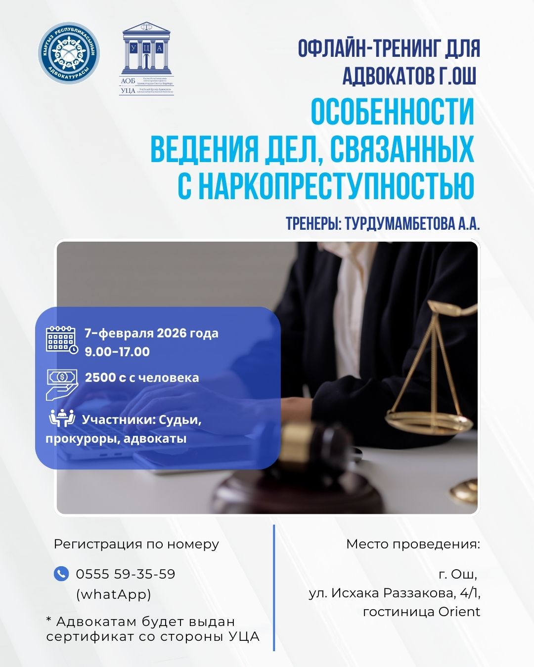 Для дополнительной информации просим обращаться к Бегимай Кожомкуловой по номеру: 0 (555) 593-559 (WhatsApp)или по email: centradvocatov24@gmail.com